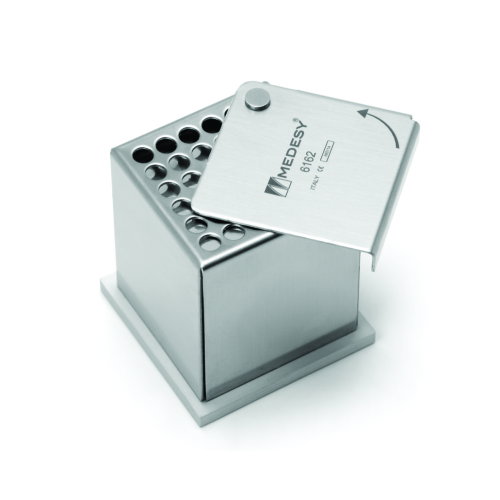 El dispensador de algodón esta fabricado de acero quirúrgico. medidas 45x45x50 mm