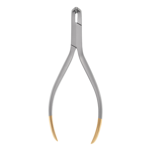 El alicate corta y sujeta porción de alambre en exceso, desarrollado para alambre de acero inoxidable y NITI, máximo 0.16 X 0.21, largo de 120mm.