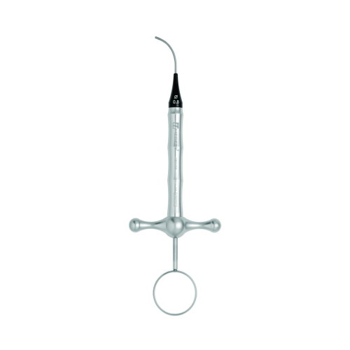 El aplicador de MTA curvo esta fabricado en aluminio, lo que lo hace muy ligero, el diámetro de la punta es de 0.8mm su largo es de 150mm.
