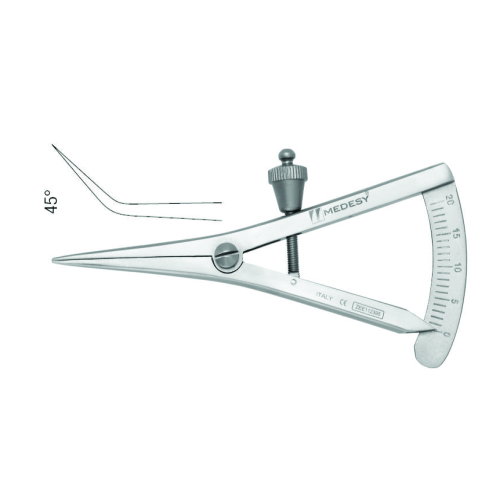 El calibrador tipo castroviejo esta fabricado de acero quirúrgico con una angulación de 45°, mide 85mm de largo.