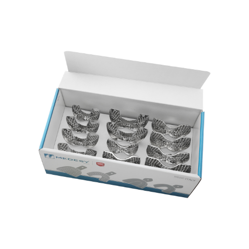 Kit de cubetas de impresión metálica de 12 piezas perforadas sin borde de retención, el set contiene cubetas superiores e inferiores XXS-XS-S-M-L-XL.