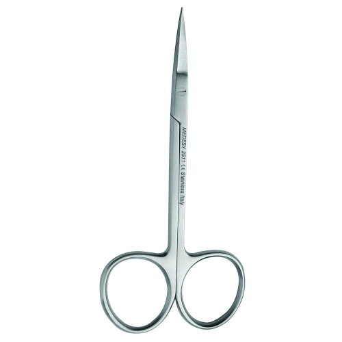 La tijera iris recta mide 115 mm de largo, su punta es fina y está fabricada en acero quirúrgico.